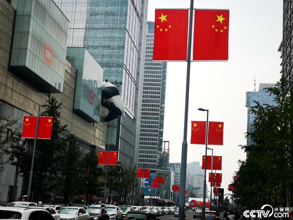 成都国际金融中心道路两边国旗飘扬。(记者 何川 摄)