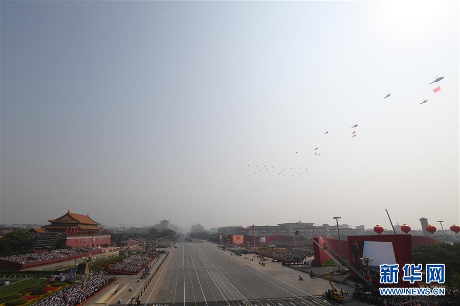 10月1日上午,庆祝中华人民共和国成立70周年大会在北京天安门广场隆重举行。这是空中护旗梯队。 新华社记者申宏摄