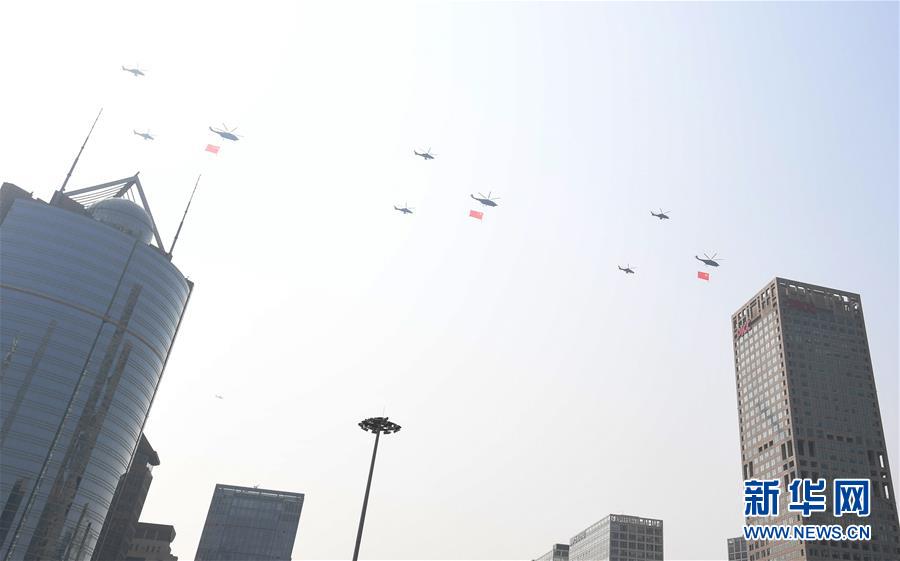 10月1日上午,庆祝中华人民共和国成立70周年大会在北京天安门广场隆重举行。这是空中护旗梯队。 新华社记者 邓华 摄​
