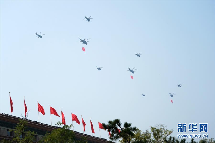 10月1日上午,庆祝中华人民共和国成立70周年大会在北京天安门广场隆重举行。这是空中护旗梯队护卫中国共产党党旗、中华人民共和国国旗、中国人民解放军军旗飞过天安门广场上空。 新华社记者 李刚 摄