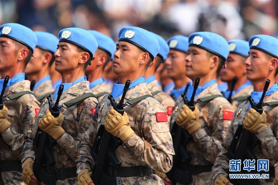 10月1日上午,庆祝中华人民共和国成立70周年大会在北京天安门广场隆重举行。 这是行进中的维和部队方队。 新华社记者 任珑 摄