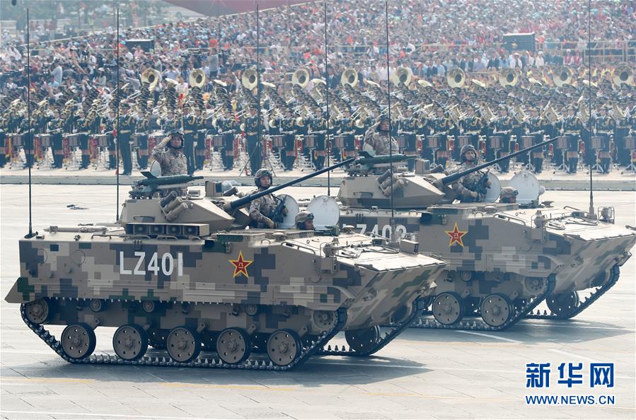 10月1日上午,庆祝中华人民共和国成立70周年大会在北京天安门广场隆重举行。这是空降兵战车方队接受检阅。 新华社记者 殷刚 摄