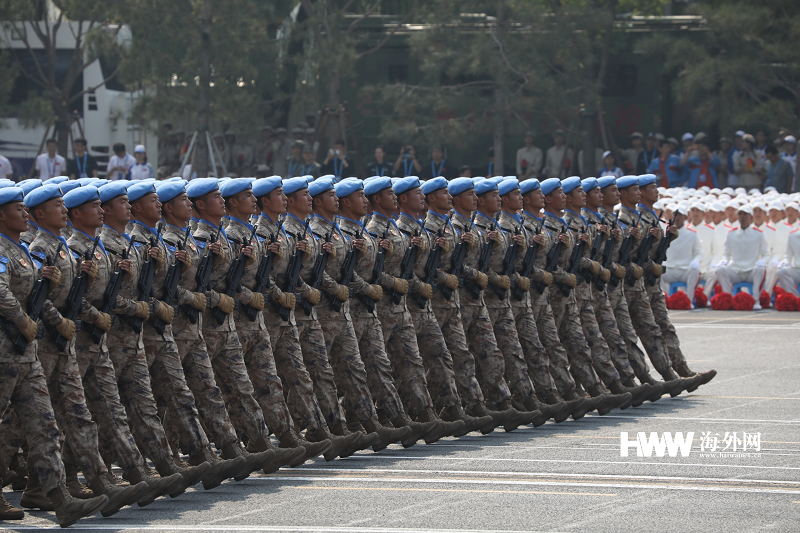 头戴蓝色贝雷帽、胸佩蓝色丝巾的维和部队方队,同样是首次在国庆阅兵中接受检阅。(谢明 摄)