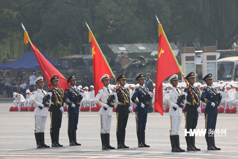 海外网10月1日电 10月1日上午,庆祝中华人民共和国成立70周年大会在北京天安门广场隆重举行。15个徒步方队依次通过天安门广场,接受祖国和人民的检阅。党旗、国旗、军旗迎风招展。(谢明 摄)