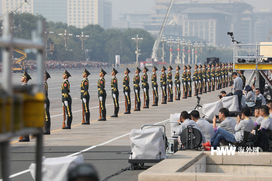 图为标兵就位,庆祝大会举行升国旗仪式,70响礼炮响彻云霄。(谢明 摄)