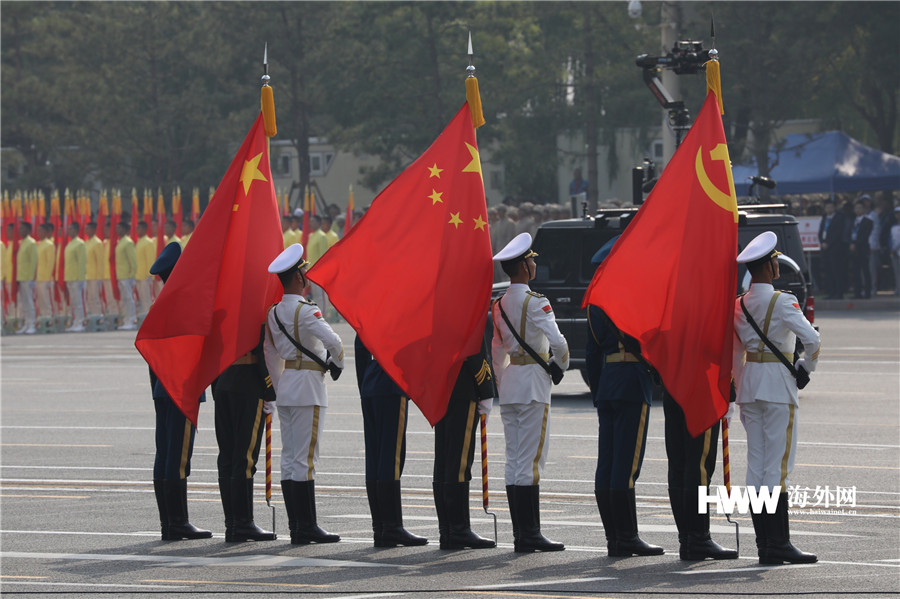 海外网10月1日电 10月1日,中华人民共和国喜迎七十华诞,举国欢庆。上午10时,庆祝中华人民共和国成立70周年大会在北京天安门广场隆重举行。图为三军仪仗队英姿飒爽,党旗、国旗、军旗迎风招展。(谢明 摄)