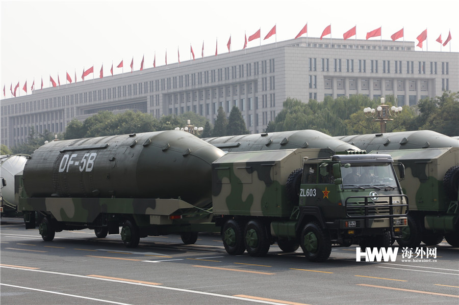 图为东风-5B核导弹方队。参加受阅的东风-5B核导弹方队,主体由火箭军某导弹旅单独组成。这个上世纪60年代初组建的老牌导弹劲旅,经过半个多世纪的发展,已经先后成功发射战略导弹数十发,成功遂行实弹发射、红蓝对抗等重大军事任务。(谢明 摄)