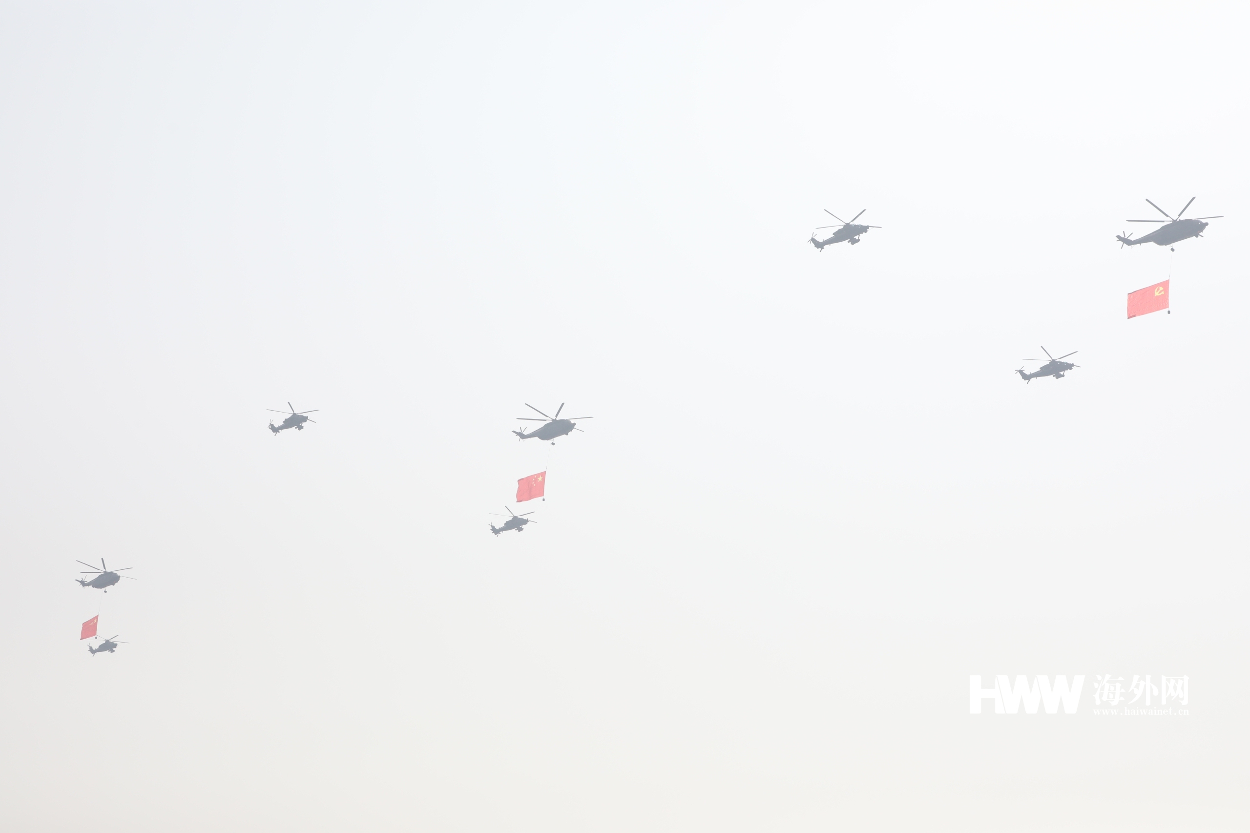 海外网现场直击:空中护旗梯队破空而来 20架直升机组成“70”字样