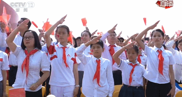 这是群众向在空中组成“70”字样的20架直升机挥手致意。新华社记者江文耀 摄