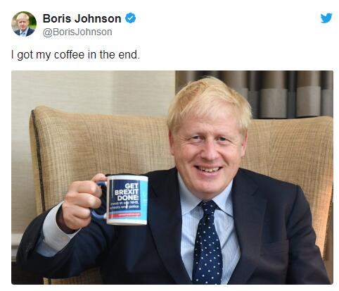不过,约翰逊对此事倒是十分淡定。晚些时候,他在推特上发了一张自己喝咖啡的照片,还不忘配文称,“我终于拿到了我的咖啡”。图片中,约翰逊举着一个马克杯,上面写着“完成脱欧”。