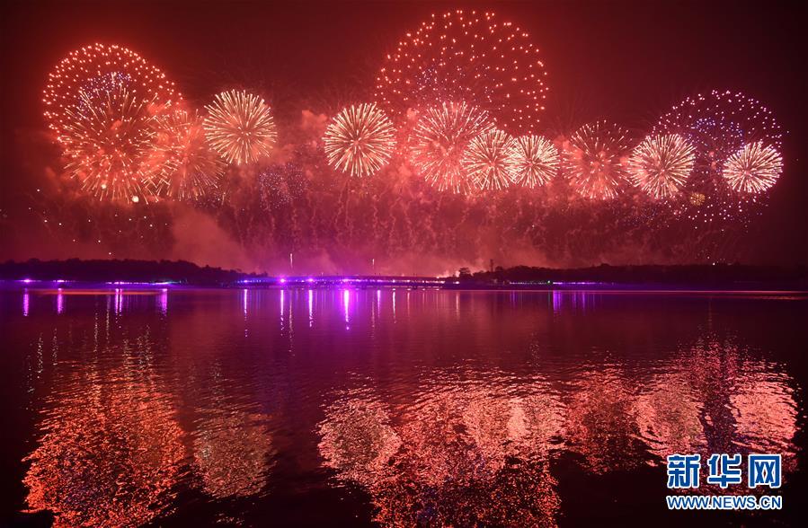 10月1日拍摄的深圳市深圳湾人才公园上空绽放的绚丽焰火。 当晚,粤港澳大湾区多个城市举行焰火晚会,庆祝中华人民共和国成立70周年。 新华社记者 周科 摄