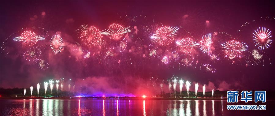 10月1日拍摄的深圳市深圳湾人才公园上空绽放的绚丽焰火。 当晚,粤港澳大湾区多个城市举行焰火晚会,庆祝中华人民共和国成立70周年。 新华社记者 周科 摄
