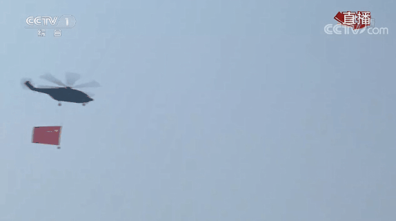 10月1日上午十时40分许,新中国成立70周年阅兵式上,9架直-8直升机分别悬挂党旗、国旗、军旗飞过天安门广场。巨幅党旗和国旗长9米、宽6米,军旗长7.5米、宽6米,在高空中经受着每小时160至180公里飞行速度的考验。