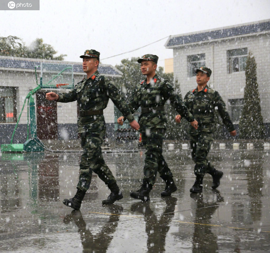2019年10月14日,宁夏石嘴山迎来第一场大雪,大雪中,武警宁夏总队石嘴山支队的执勤官兵仍然坚守在执勤岗位、训练场上,他们的坚守成为雪中一道亮丽的风景线。