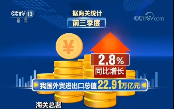 据海关统计:前三季度我国外贸进出口总值22.91万亿元,同比增长2.8%,其中出口12.48万亿元,增长5.2%,进口10.43万亿元,下降0.1%。