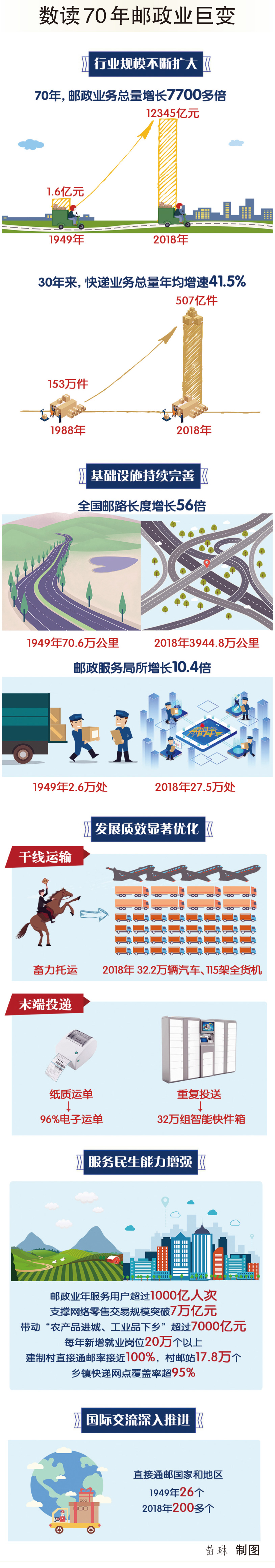 在1949年以前,与我国建立直接通邮关系的国家和地区仅26个。70年后的今天,我国已与世界200多个国家和地区建立了通邮关系。随着邮政国际化发展,民间商贸往来在世界地图上构成的连接线日益繁密,物流业务需求越来越大。2018年,我国国际/港澳台快递业务量累计完成11.1亿件,支撑跨境网络零售额突破3500亿元。拓展海外市场、开辟国际货运航线、中欧班列运输邮件快件……邮政快递企业的发展,让全世界分享“中国速度”和“中国效率”。