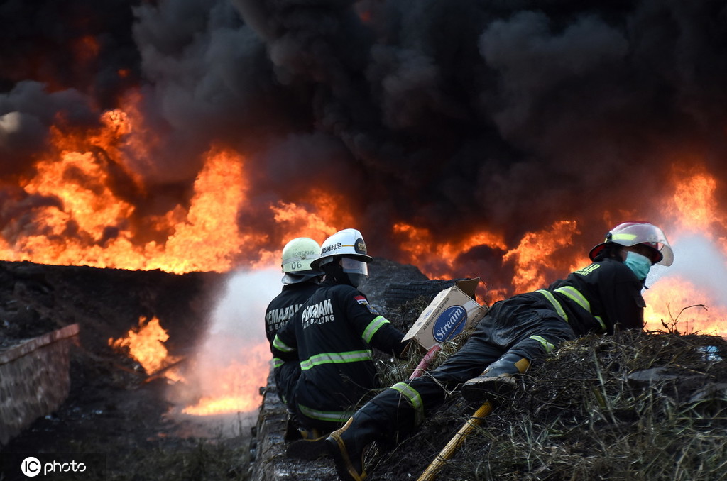 当地时间2019年10月22日,印度尼西亚西爪哇省芝马墟,石油管道破裂起火,火灾地点在一处建筑工地。图源:东方IC