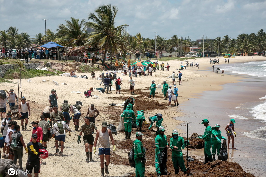 当地时间2019年10月22日,巴西伯南布哥州卡博迪圣阿戈斯蒂尼奥镇,巴西军方在当地海滩清理泄漏的油污。日前,巴西政府授权动员5000名陆军和三架空军飞机来清理和控制沿着该国东北海岸海滩蔓延的泄漏原油。图源:东方IC