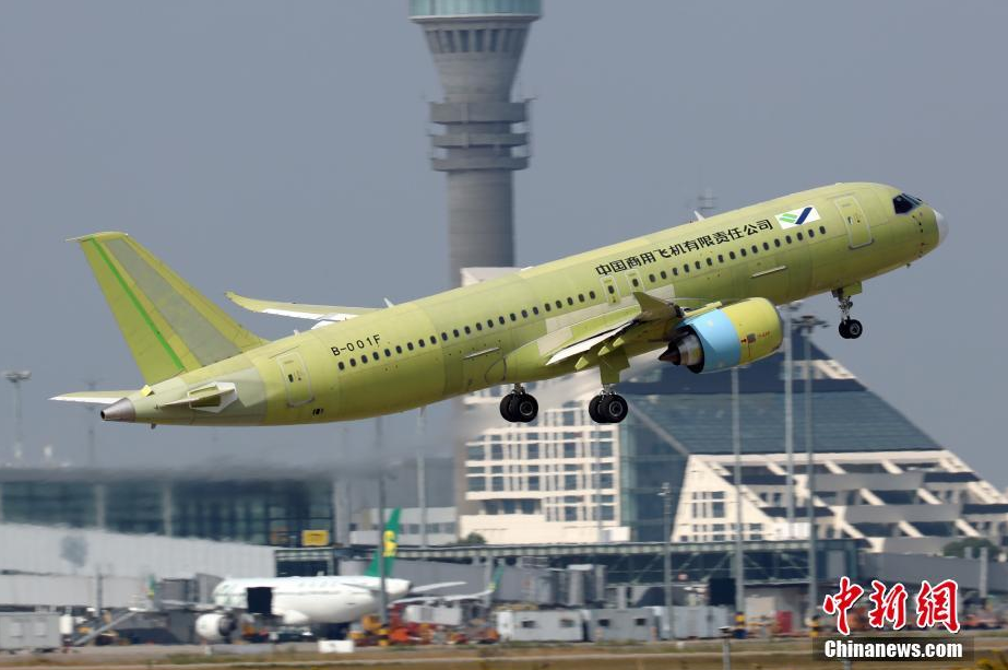 10月24日,中国C919大型客机第五架试飞飞机105架机当天上午10时从上海浦东国际机场起飞,经过1小时37分钟的空中飞行,在完成多个试验点、对飞机各系统进行了初始操纵检查后返航并平稳降落,顺利完成其首次试验飞行任务。C919大型客机105架机主要承担高温、高寒等特殊气象条件,以及环控、电源、全机排液等相关科目的试飞任务。中新社发 郑元然 摄