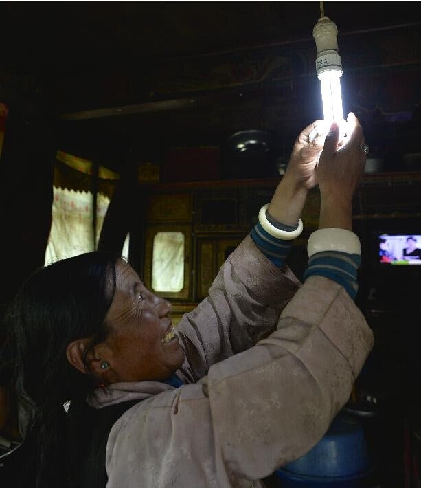 在西藏江孜县龙马乡最康村,45岁的德庆擦拭家中的节能灯。(刘东君/摄)