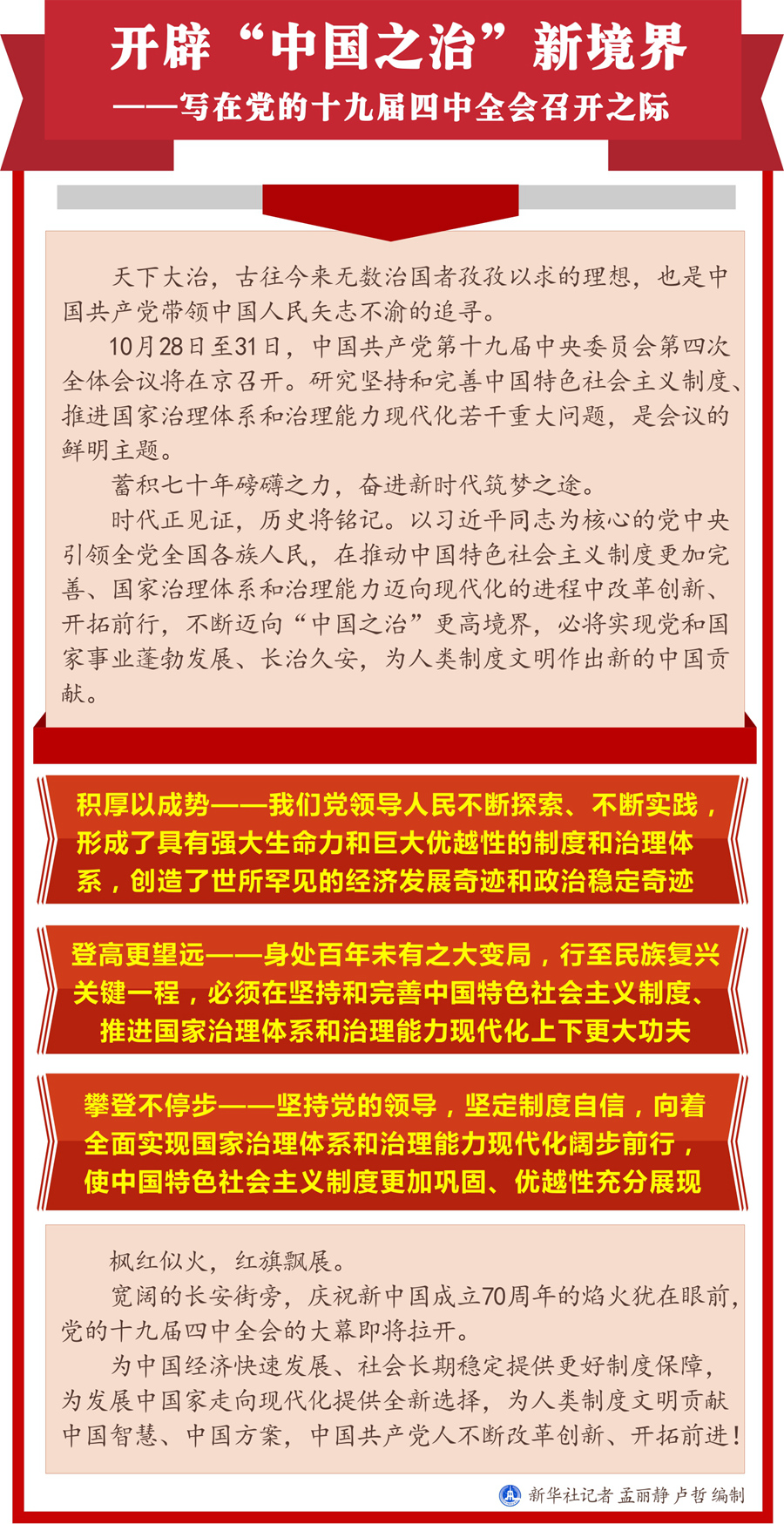 10月28日至31日,中国共产党第十九届中央委员会第四次全体会议将在京召开。研究坚持和完善中国特色社会主义制度、推进国家治理体系和治理能力现代化若干重大问题,是会议的鲜明主题。