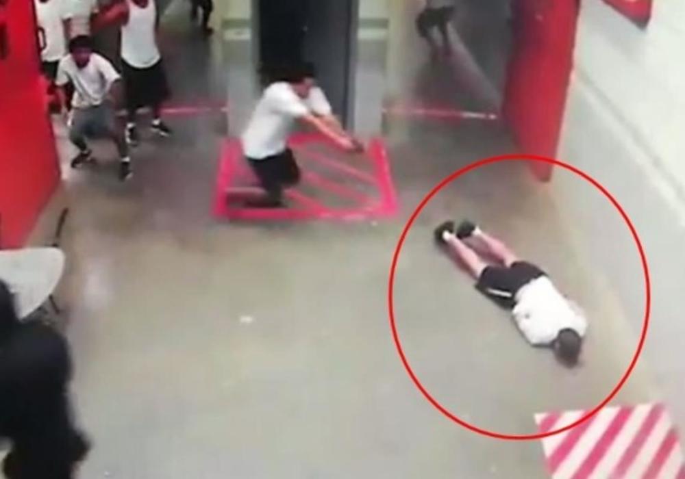 洪都拉斯当地报纸公布的监控录像显示:在首都特古西加尔巴西北约100英里(160公里)的监狱里,一名男子在警察眼皮底下被开枪击中,然后被多名囚犯反复刺伤,最终死亡。(视频截图来自YouTube)