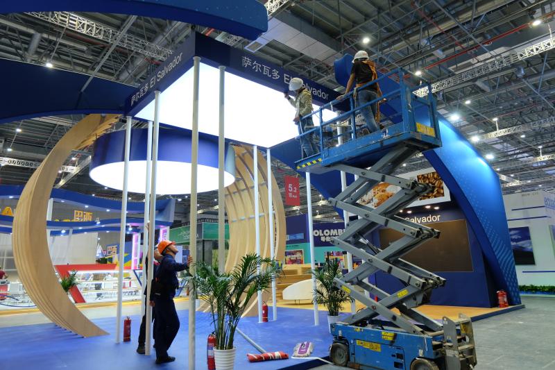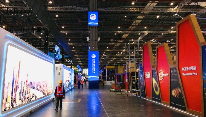 随着布展工作进入收尾阶段,国家馆的多数展台主体结构已搭建完毕,正在完成氛围布置工作。
