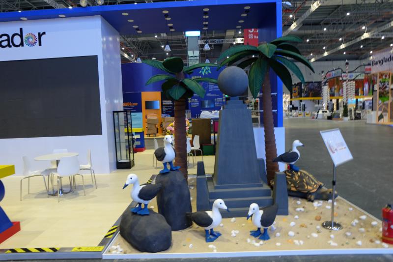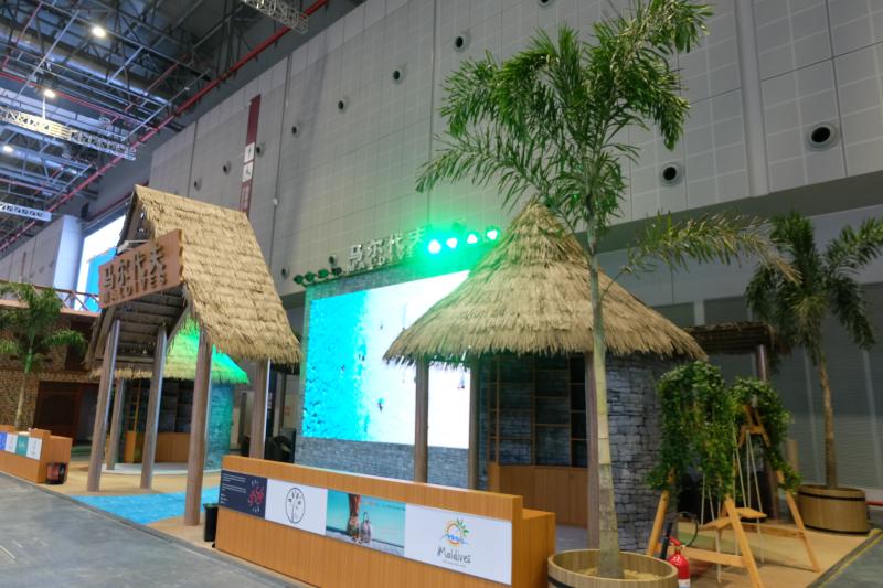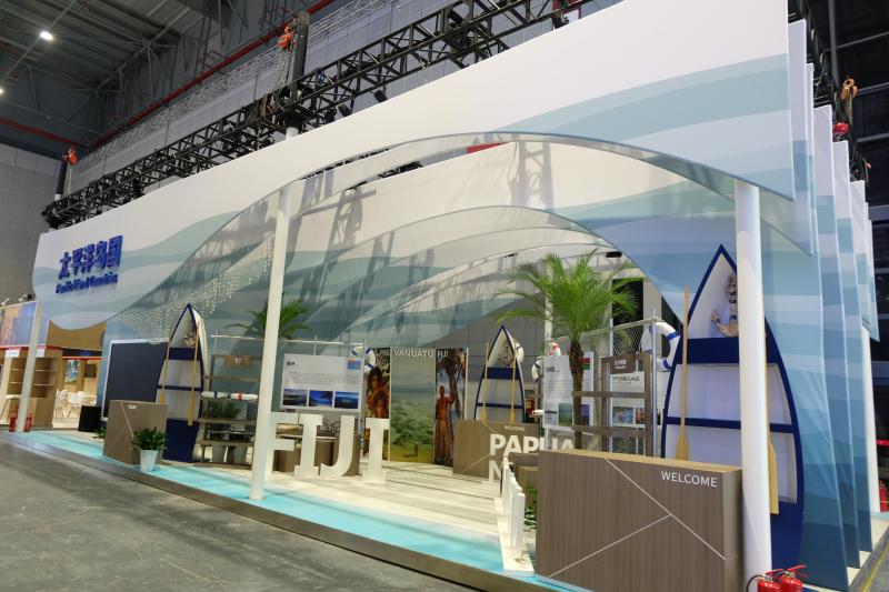 马尔代夫展台就像是一个坐拥私人海滩的度假村;厄瓜多尔也把“海鸥”和“椰林”带到了展馆;斐济、瓦努阿图、巴布亚新几内亚联合展台——太平洋岛国展台更是一展海岛风情,以蓝色海洋为设计灵感,寓意着“21世纪海上丝绸之路”。扬起的风帆与海水的浪涌相结合,代表了开放的海洋文明与东西方文化的融合,展馆内部则对各岛屿的不同文化进行了多样性的展现。