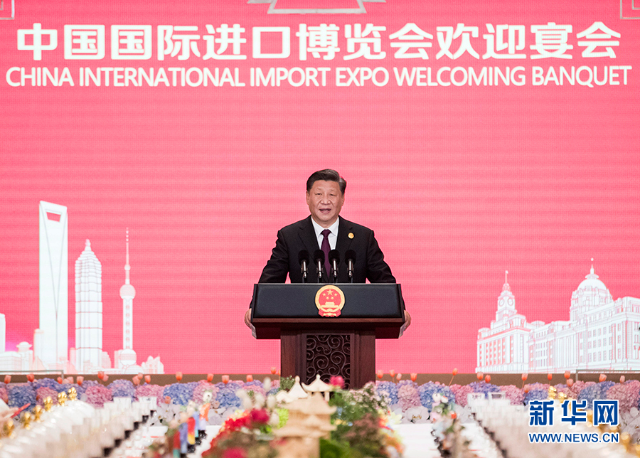 11月4日晚,国家主席习近平和夫人彭丽媛在上海和平饭店举行宴会,欢迎出席第二届中国国际进口博览会的各国贵宾。这是习近平发表致辞。 新华社记者 王晔 摄