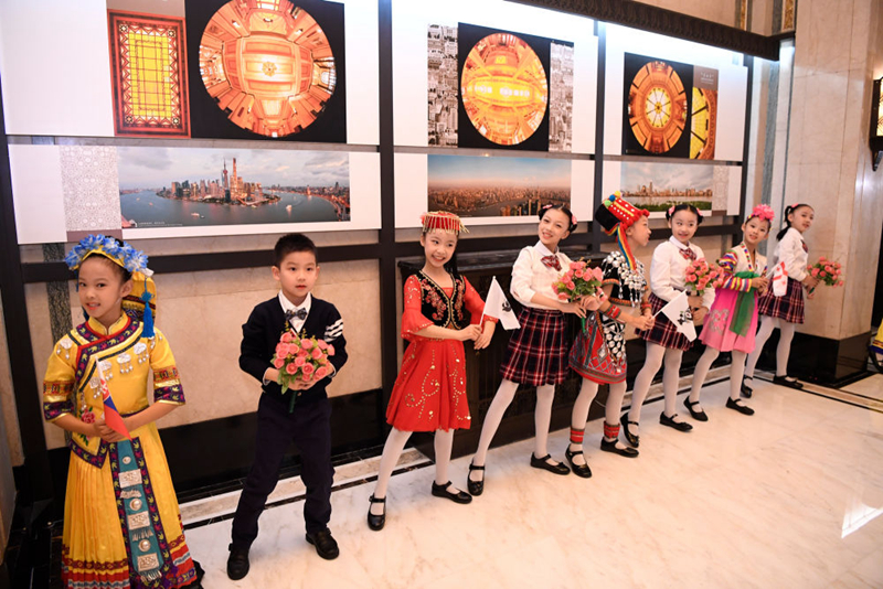 身着各民族服装的少年儿童载歌载舞,迎接嘉宾到来——