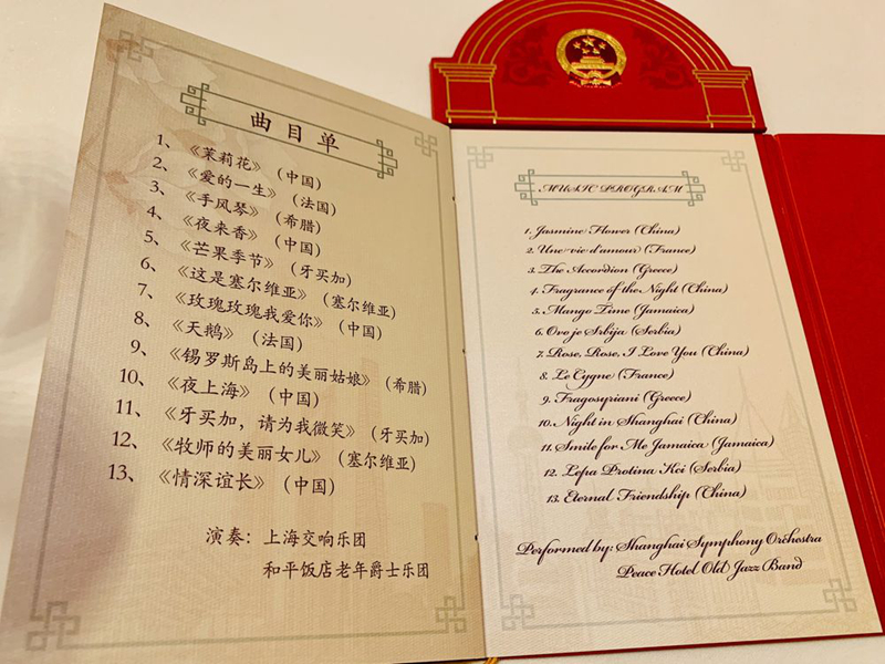 晚宴上,来自上海交响乐团、和平饭店老年爵士乐团的乐手们,演奏了中国、法国、希腊、牙买加、塞尔维亚的13首名曲,让各国客人宾至如归。