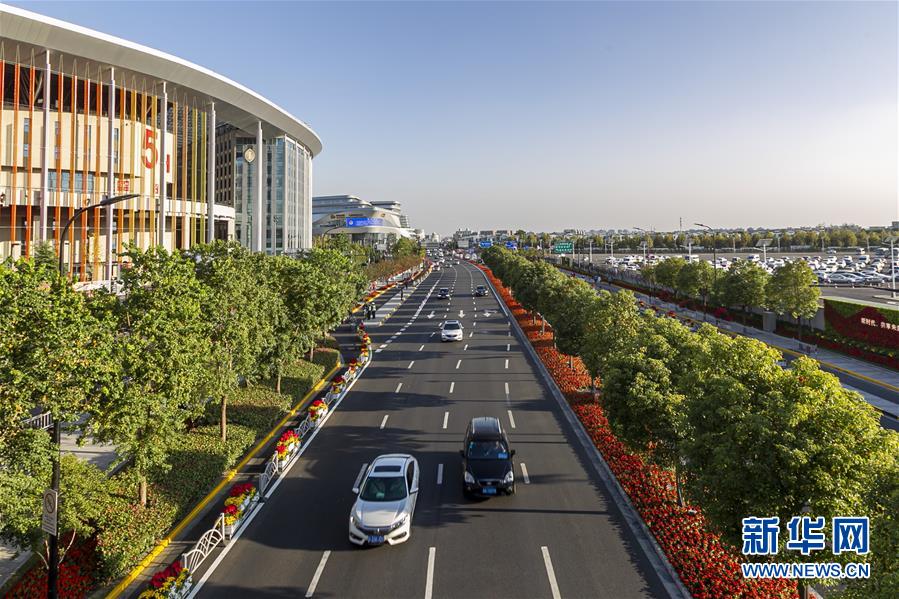 11月3日拍摄的国家会展中心(上海)西入口外街边的花卉装饰。新华社发(王翔摄)