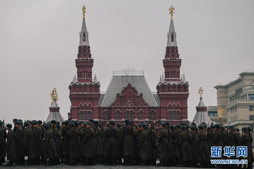 11月5日,士兵在俄罗斯莫斯科红场参加纪念1941年红场阅兵78周年彩排。 1941年11月7日举行的莫斯科红场阅兵式具有历史意义。当时,苏联正处于卫国战争最艰难阶段,纳粹德国军队兵临莫斯科城下。苏联士兵参加完红场大阅兵后,直接开赴几十公里外的莫斯科郊外与侵略者作战。 新华社发(西尼岑 摄)