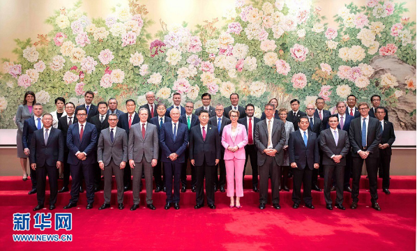 11月5日,第二届中国国际进口博览会在上海国家会展中心开幕。国家主席习近平出席开幕式并发表题为《开放合作 命运与共》的主旨演讲。这是开幕式前,习近平亲切会见世界500强企业家代表。新华社记者 李涛 摄