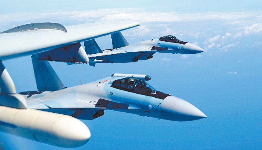 这张照片是苏-35战机与轰-6K战机的“同框照”(刘锐 摄)。2018年5月11日,空军组织东部、南部战区空军协同行动,出动轰炸机、侦察机双向绕飞台岛巡航。苏-35战机首次与轰-6K战机编队飞越巴士海峡,实现了绕岛巡航模式的新突破,彰显了空军体系作战能力的新提升。