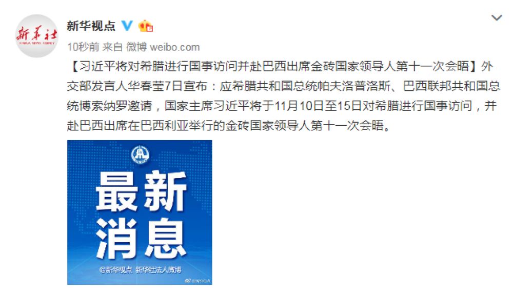 外交部发言人华春莹7日宣布:应希腊共和国总统帕夫洛普洛斯、巴西联邦共和国总统博索纳罗邀请,国家主席习近平将于11月10日至15日对希腊进行国事访问,并赴巴西出席在巴西利亚举行的金砖国家领导人第十一次会晤。