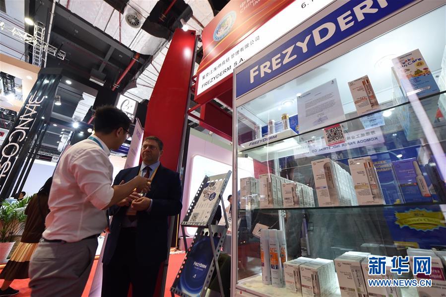 这是11月8日在第二届进博会上拍摄的希腊药妆品牌芙蕾姿德展台。 新华社记者 尹炣 摄