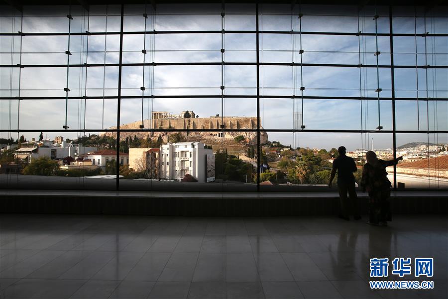 这是11月7日从希腊雅典卫城博物馆内拍摄的远处的雅典卫城。 雅典卫城博物馆的前身于1886年建于卫城山丘,距卫城300米的新馆在2009年正式开放,馆内保存着女像柱、帕特农神庙雕塑等名作。 新华社发(马里奥斯·罗洛斯 摄)