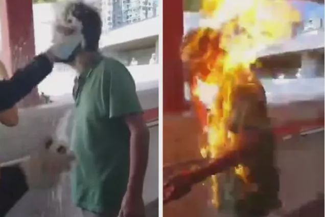 11日下午,在香港马鞍山地区一座天桥上,一群暴徒因不满一名57岁市民反对他们的破坏活动而与其发生口角。在对该市民进行殴打之后,暴徒竟然向其浇淋易燃液体并点火焚烧,导致该市民瞬间成为“火人”,全身大面积严重烧伤,生命危殆。这种光天化日之下杀人放火的行径骇人听闻、灭绝人性,是对法律底线、道德底线、人类文明底线的严重践踏。