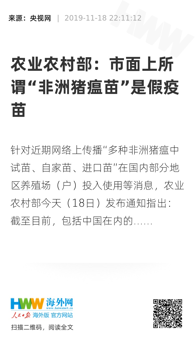 如发现非法非洲猪瘟疫苗以及其他兽药相关线索,请社会各界特别是养殖者及时举报并尽量提供可核查的线索,农业农村部将及时组织做好举报核查工作。一经查实,严肃处理。(央视记者 王凯博 刘成)