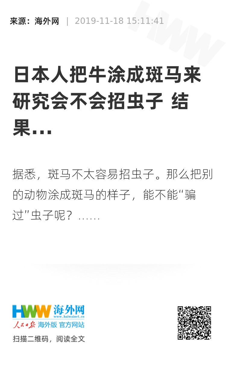 据日本NHK电视台消息,外国研究学者曾得出过一个研究结果:虫子不怎么接近斑马。为了验证这一结论是否能在“化妆”成斑马模样的牛身上适用,日本爱知县长久手市的爱知县农业综合试验场和京都大学共同对此开展了研究。