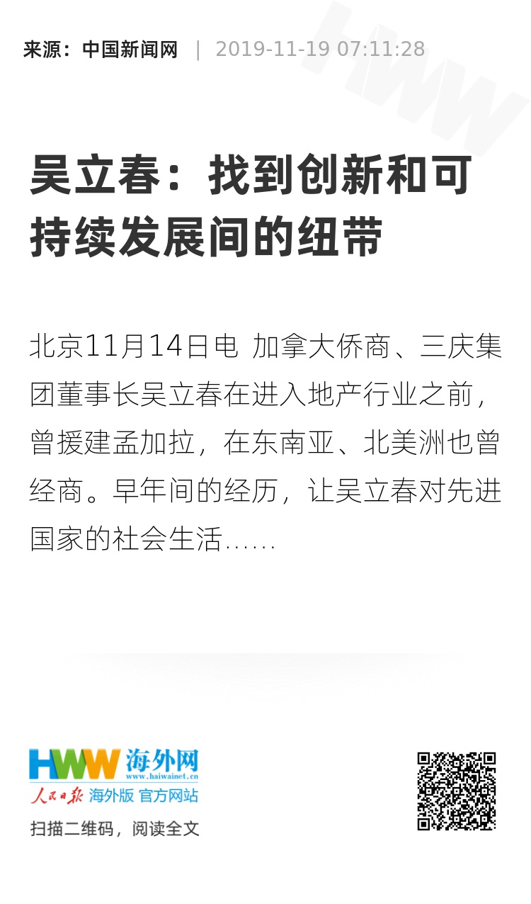 中新网北京11月14日电 加拿大侨商、三庆集团董事长吴立春在进入地产行业之前,曾援建孟加拉,在东南亚、北美洲也曾经商。早年间的经历,让吴立春对先进国家的社会生活、市场理念印象深刻,他决定把自己的所见所学付诸行动。