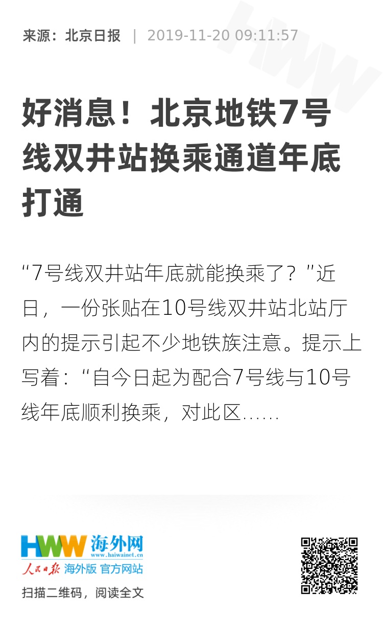 “7号线双井站年底就能换乘了?”近日,一份张贴在10号线双井站北站厅内的提示引起不少地铁族注意。提示上写着:“自今日起为配合7号线与10号线年底顺利换乘,对此区域进行临时封闭。”有地铁族就猜测,双井站换乘通道将要在年底提前打通了。对此,记者联系了北京轨道交通建设管理有限公司相关人士,并得到了证实。