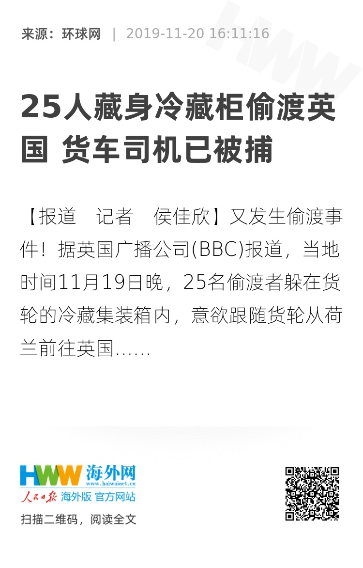 【环球网报道 记者 侯佳欣】又发生偷渡事件!据英国广播公司(BBC)报道,当地时间11月19日晚,25名偷渡者躲在货轮的冷藏集装箱内,意欲跟随货轮从荷兰前往英国。不料,一名货轮船员发现了他们并且立即报警。返航后,这些人被警方带走。