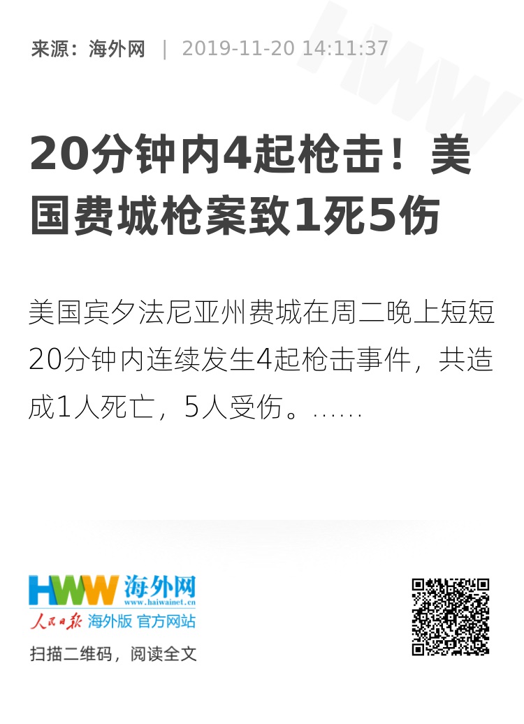 海外网11月20日电 当地时间周二(19日)晚上,美国宾夕法尼亚州费城在短短20分钟内连续发生四起枪击事件,共造成1人死亡,5人受伤。当地警方表示正在全力调查。