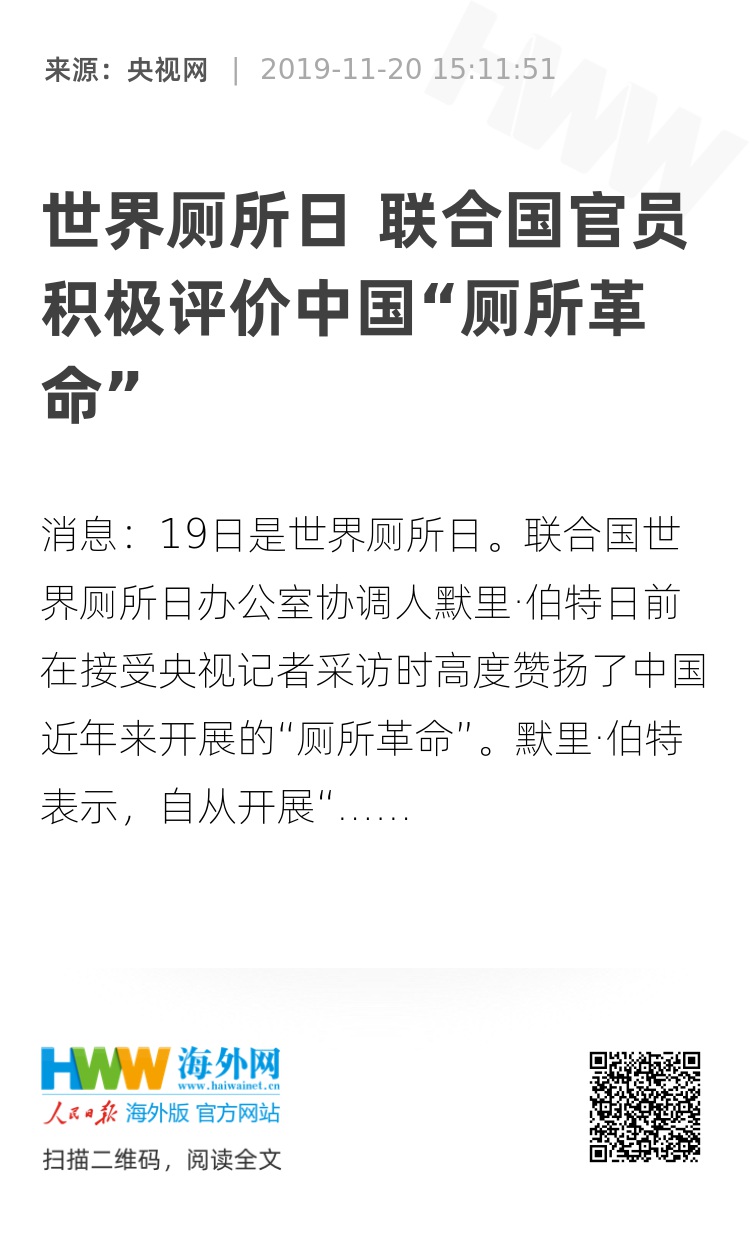 世界厕所日办公室协调人 默里·伯特:中国正在开展“厕所革命”,我认为是非常棒的理念。总的来说,中国城市的卫生设施很好,我看到中国的“厕所革命”主要聚焦旅游景点和乡村、贫困地区和那些卫生设施还没有覆盖的地方。在“厕所革命”的进程中,中国做了很多工作。