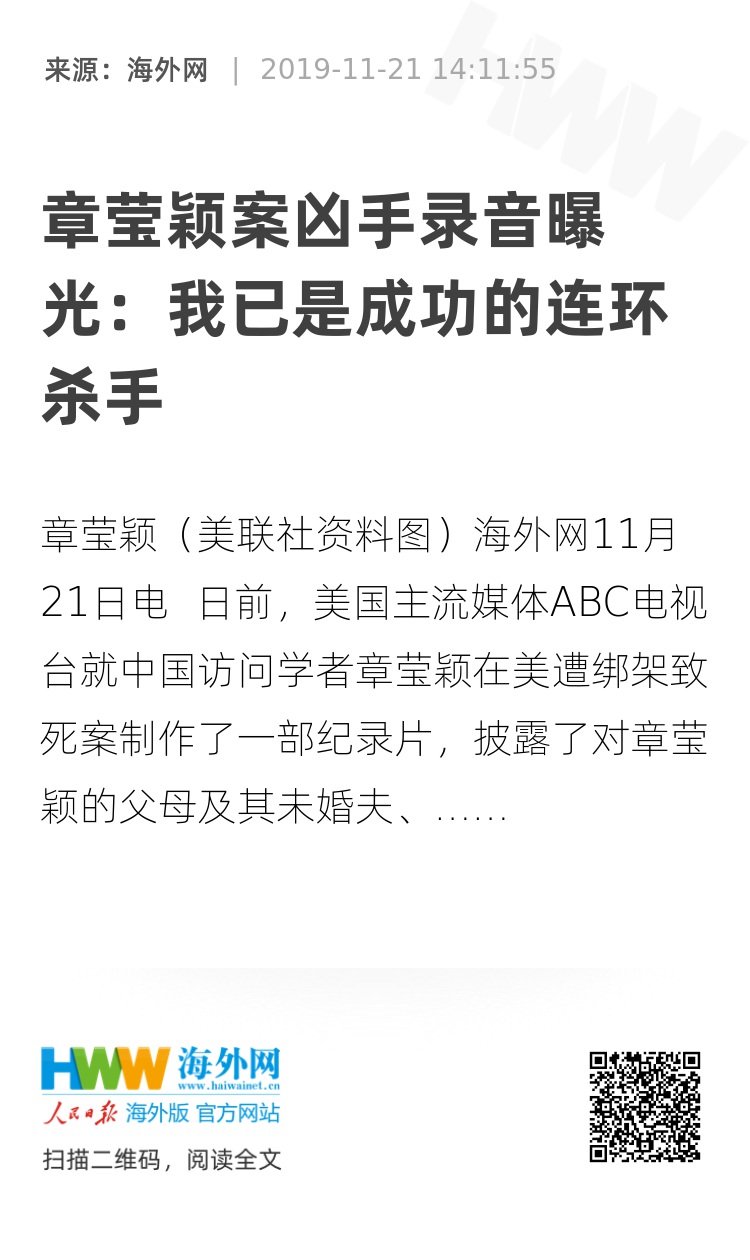 海外网11月21日电 日前,美国主流媒体ABC电视台就中国访问学者章莹颖在美遭绑架致死案制作了一部纪录片,披露了对章莹颖的父母及其未婚夫、对凶手克里斯滕森父亲的独家采访等内容。其中,FBI委托克里斯滕森前女友暗中偷录的音频也一并播出,凶手对其女友大谈章莹颖死前如何全力反抗,并自称“已是一名成功的连环杀手”,让人不寒而栗。