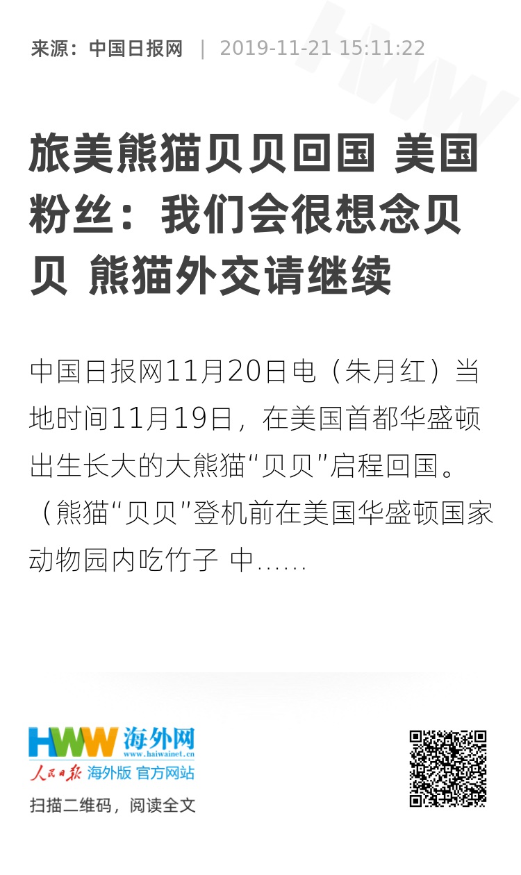 美国有线电视新闻网11月19日报道称,集万千宠爱于一身的贝贝于当地时间19日从华盛顿乘专机返回中国,它的告别仪式相当“引人关注”。