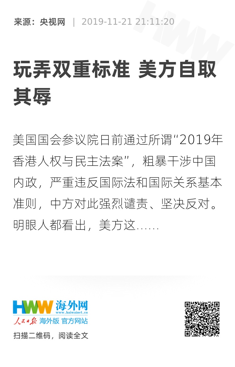美国国会参议院日前通过所谓“2019年香港人权与民主法案”,粗暴干涉中国内政,严重违反国际法和国际关系基本准则,中方对此强烈谴责、坚决反对。明眼人都看出,美方这份所谓法案既不为“民主”,也不为“人权”,不过是以它们为幌子来为激进暴力犯罪分子撑腰打气,实则干的是反中乱港的卑劣勾当。这种“长臂管辖”的霸道行径非但不会得逞,反而再次暴露了美式双重标准的作派,极端虚伪,令人不齿。