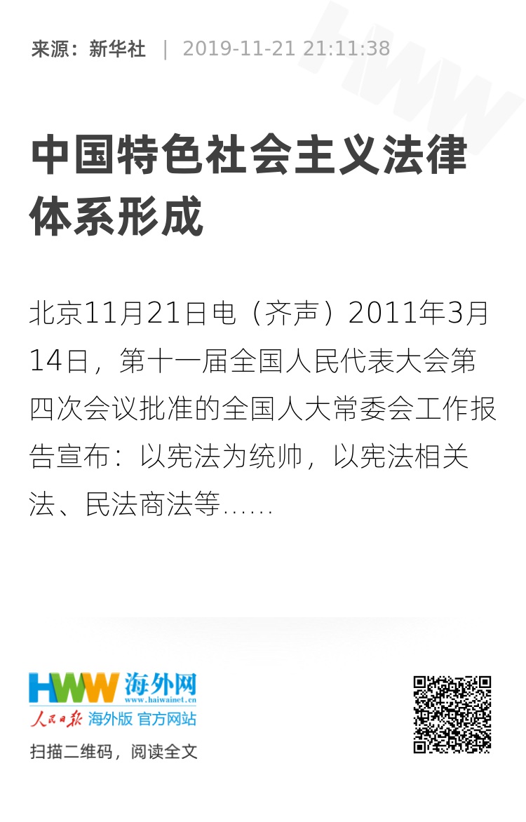 新华社北京11月21日电(齐声)2011年3月14日,第十一届全国人民代表大会第四次会议批准的全国人大常委会工作报告宣布:以宪法为统帅,以宪法相关法、民法商法等多个法律部门的法律为主干,由法律、行政法规、地方性法规等多个层次的法律规范构成的中国特色社会主义法律体系已经形成,国家经济建设、政治建设、文化建设、社会建设以及生态文明建设的各个方面实现有法可依,党的十五大提出到2010年形成中国特色社会主义法律体系的立法工作目标如期完成。